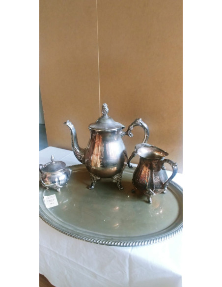 JUEGO DE BANDEJA, AZUCARECA, TETERA Y JARRA PARA TÉ DE METAL PLATEADO.