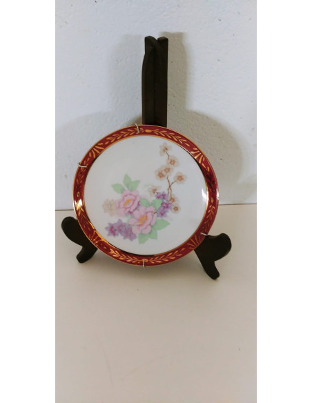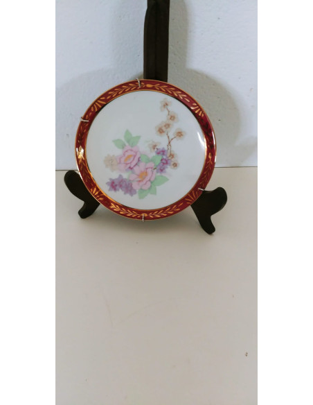 PLATO SARDA BORDE ROJO FONDO BLANCO Y DECORACION FLORAL 17 CM DIAMETRO
