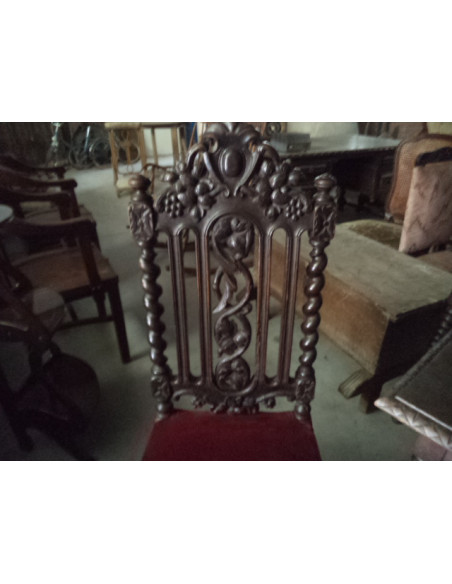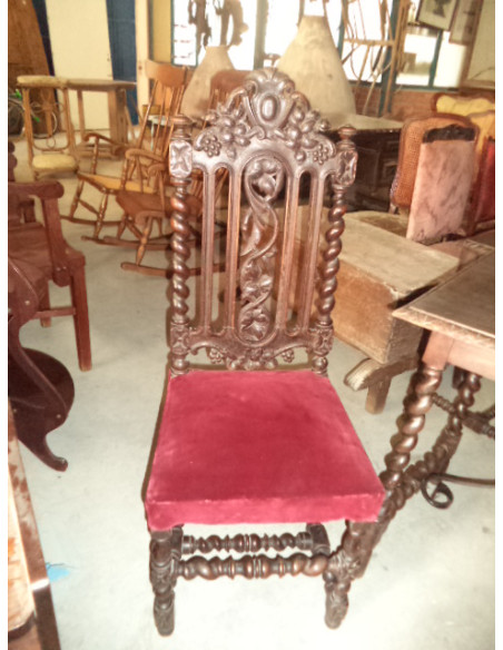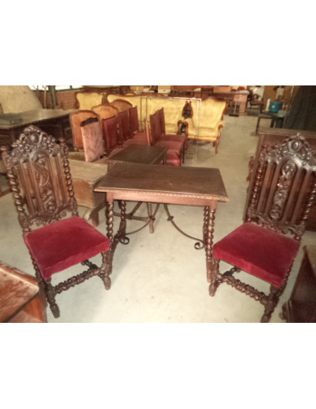 CONJUNTO DE MADERA TALLADA , ESTILO CASTELLANO, MESA Y DOS SILLAS TAPIZADAS DE ANTE ROJO
