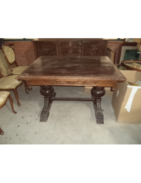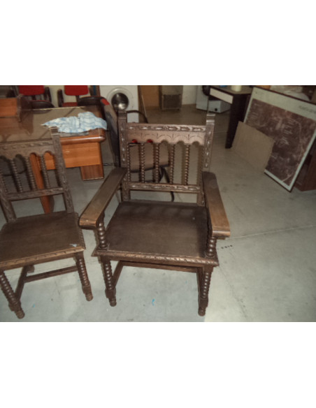 CONJUNTO DE MADERA TALLADA EN ESTILO CASTELLANO, COMPUESTO POR DOS SILLONES, 6 SILLAS Y UNA MESA