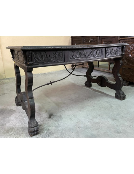 MESA DE DESPACHO DE MADERA ANTIGUA CON TRES CAJONES, DETALLES GRABADOS EN MADERA Y DETALLES DE FORJA EN LAS PATAS