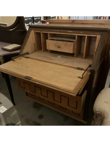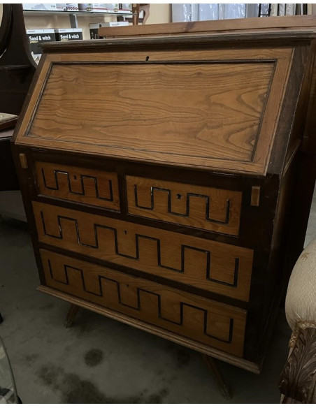 ESCRITORIO DE MADERA ANTIGUO PLEGABLE CON COMPARTIMENTOS EN EL INTERIOR, DOS CAJONES GRANDES Y DOS CAJONES PEQUEÑOS.