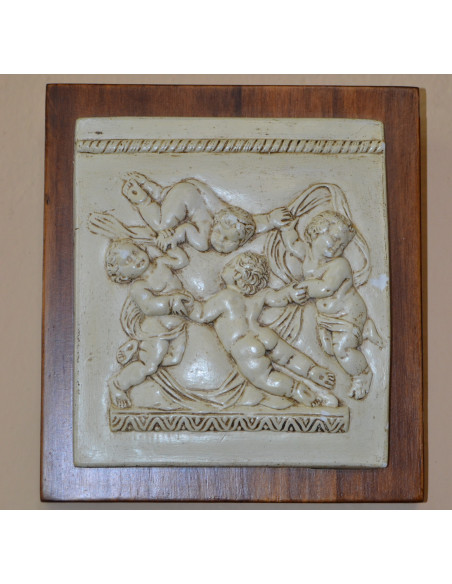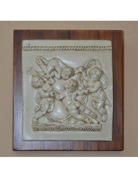 CUADRO DE MADERA CON ANGELES TALLADOS EN CEMENTO BLANCO