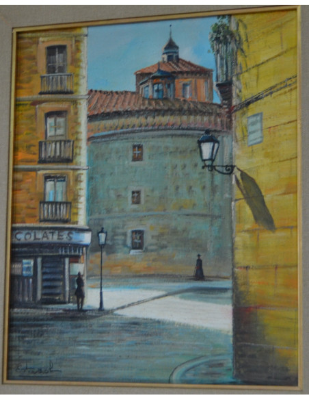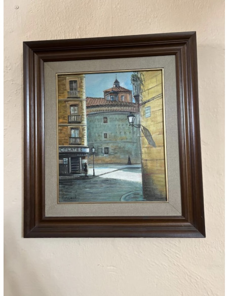CUADRO CON MARCO DE MADERA, CON IMAGEN DE LAS CALLES QUE LLEVAN A UNA IGLESIA.