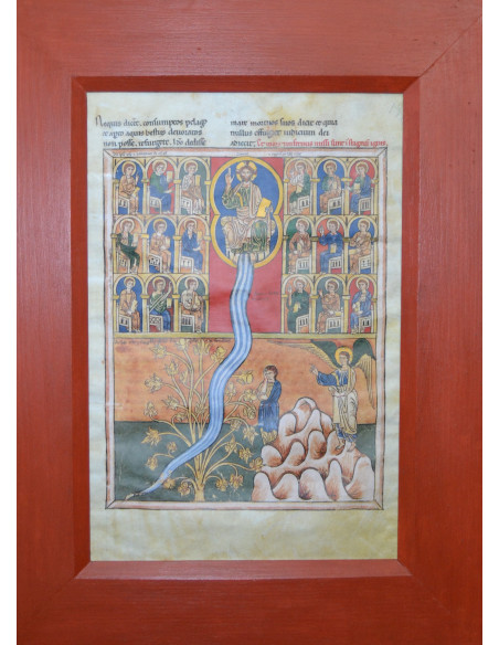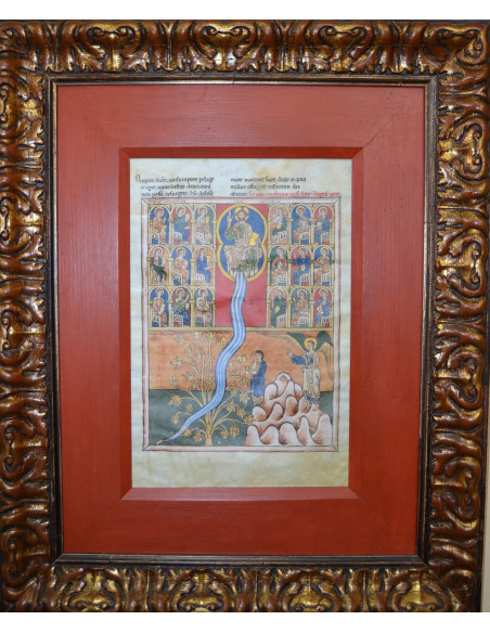 CUADRO CON MARCO DE MADERA TALLADO CON DETALLES DORADOS Y FONDO ROJO, IMAGEN DEL APOCALIPSIS SIGLO VIII