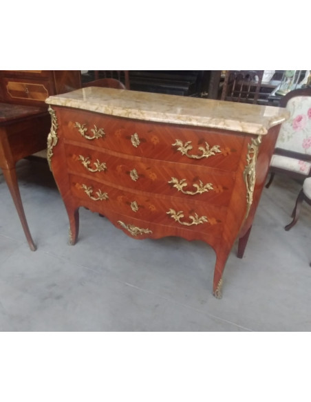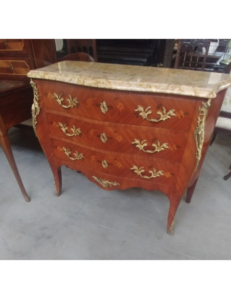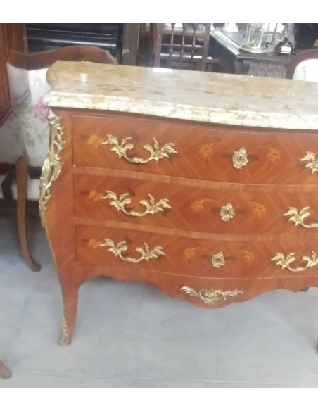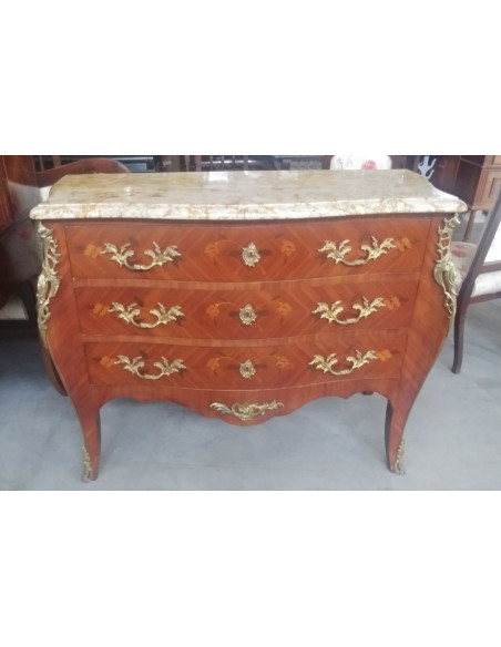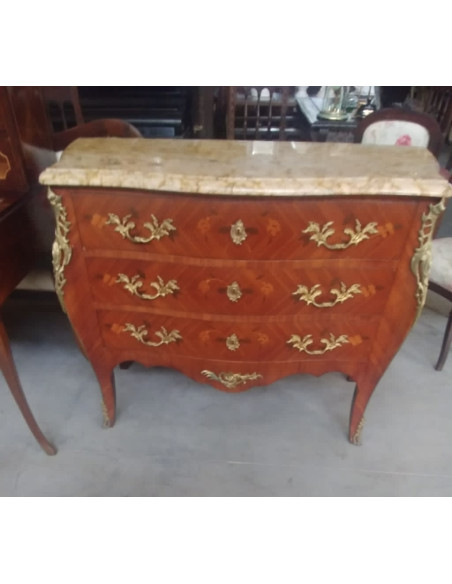 ANTIGUA COMODA LUIS XV ESTILO COFRE CON 3 CAJONES, TIRADORES ANTIUGUOS Y BASE DE MARMOL