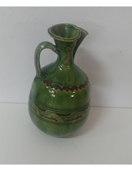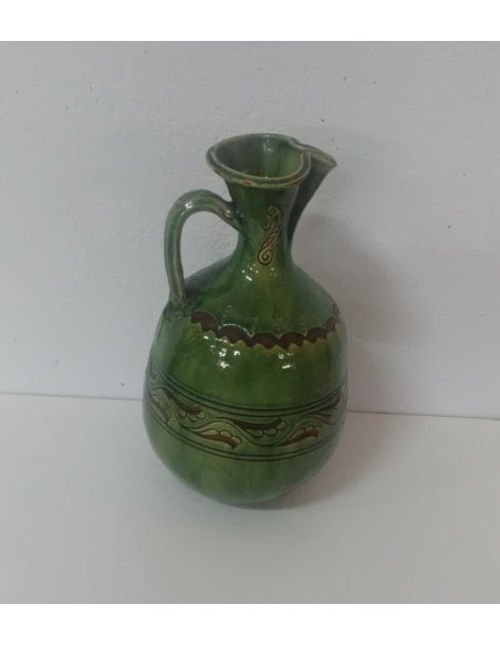 JARRA VERDE DE CERAMICA CON UN ASA Y DETALLES GRABADOS