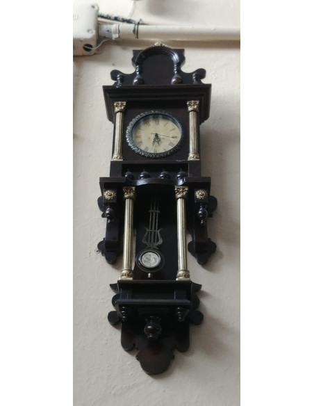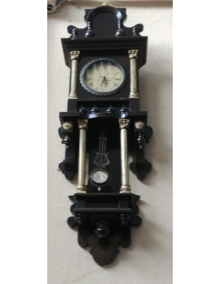 RELOJ DE PARED DE MADERA, MARRON OSCURO, CON PENDULO Y NUMEROS ROMANOS
