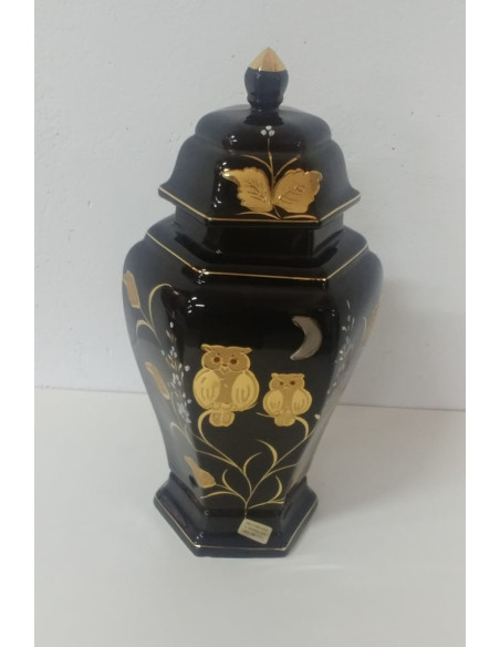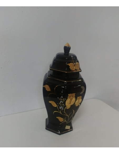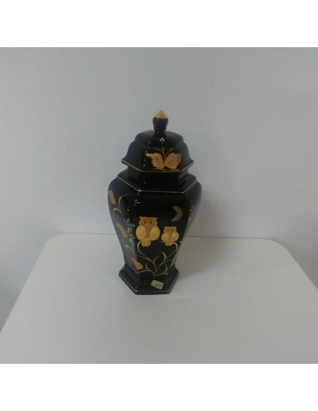 JARRON DE PORCELANA, NEGRO CON DETALLES DORADOS Y BUHOS DORADOS, CON TAPA