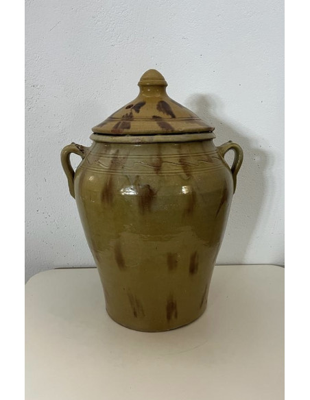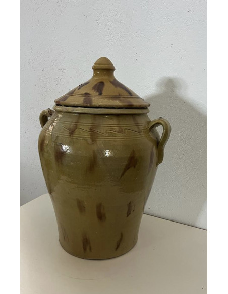 BUCARO DE BARRO CON TAPA COLOR VERDOSO Y CON DOS ASAS. 37 CM DE ALTURA