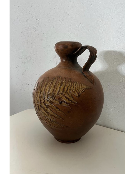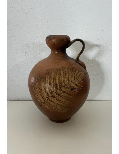 JARRON DE BARRO MARRON, CON ASA Y ESPIGA EN RELIEVE