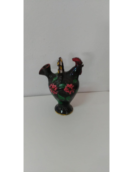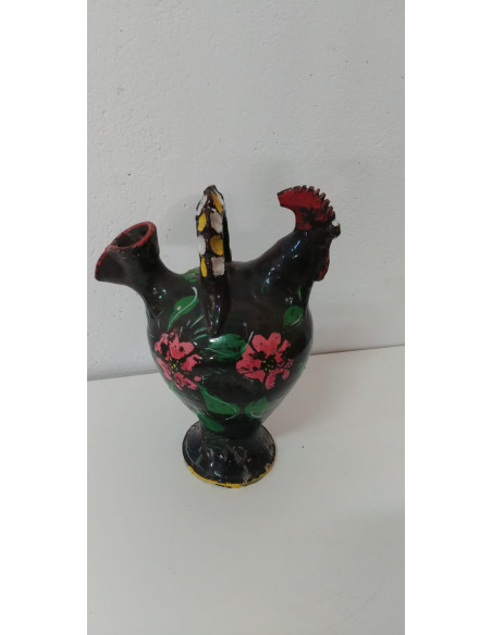 BOTIJO NEGRO EN FORMA DE GALLO CON ASA Y DECORACION FLORAL