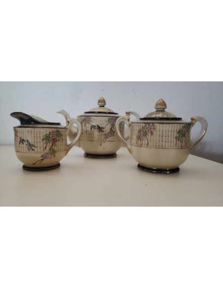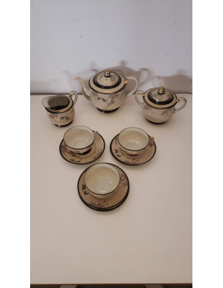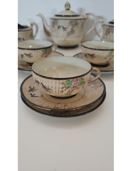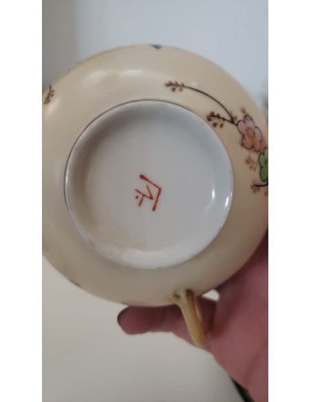 JUEGO DE CAFE, 3 TAZAS, 6 PLATOS, CAFETERA, AZUCARERA Y LECHERA, BEIGE CON DECORACION FLORAL CHINA.