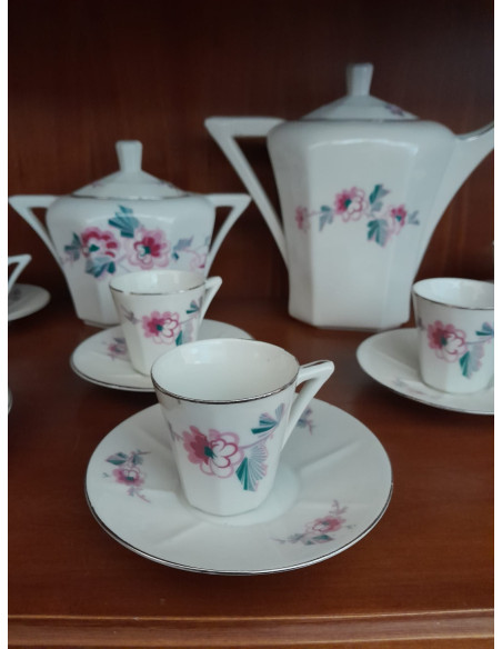 JUEGO DE CAFE LIMOGE, 12 TAZAS, 12 PLATOS, AZUCARERA Y JARRA CAFE, BLACO CON DECORACION FLORAL.