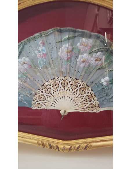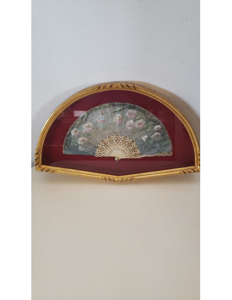 ABANICO VENECIANO ANTIGUO, GRIS AZULADO, TELA PINTADA A MANO CON INCRUSTACION DE ORO LIQUIDO Y NACAR. EN MARCO DE CRISTAL
