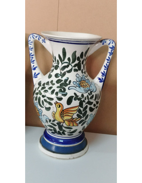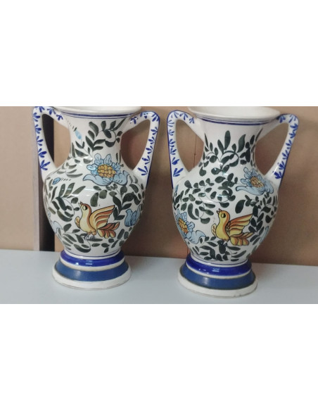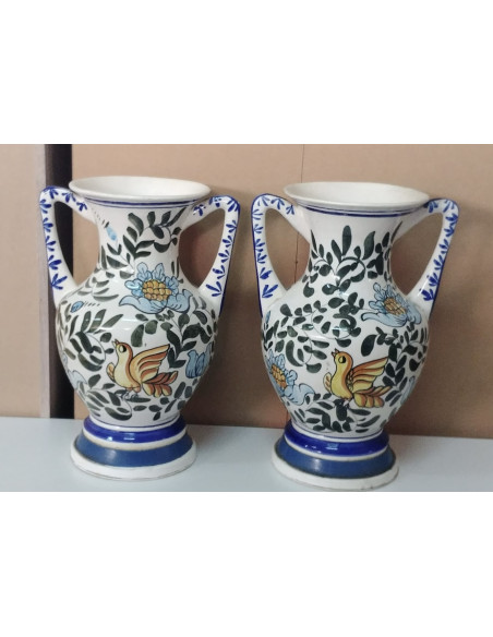 JARRONES DE DOS ASAS A JUEGO CON DECORACION FLORAL Y PAJARO
