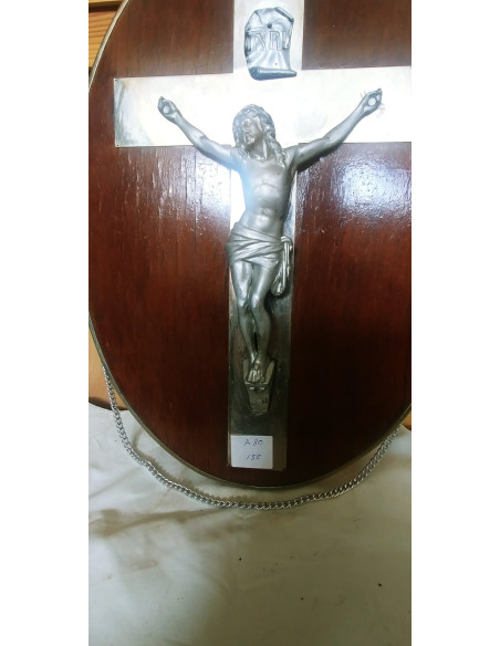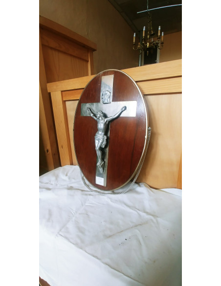 CRUCIFIJO DE METAL EN CUADRO OVALADO DE MADERA