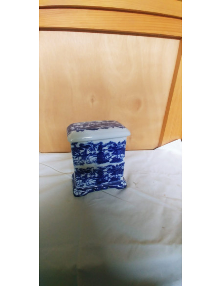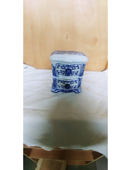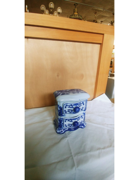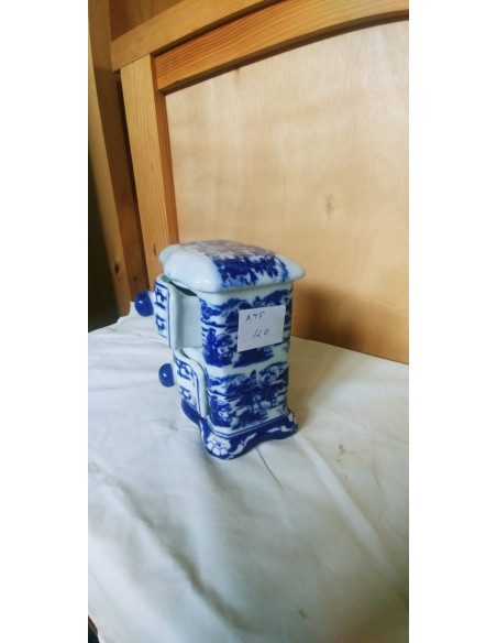 FIGURA DE CERAMICA EN FORMA DE MESITA BLANCA Y AZUL