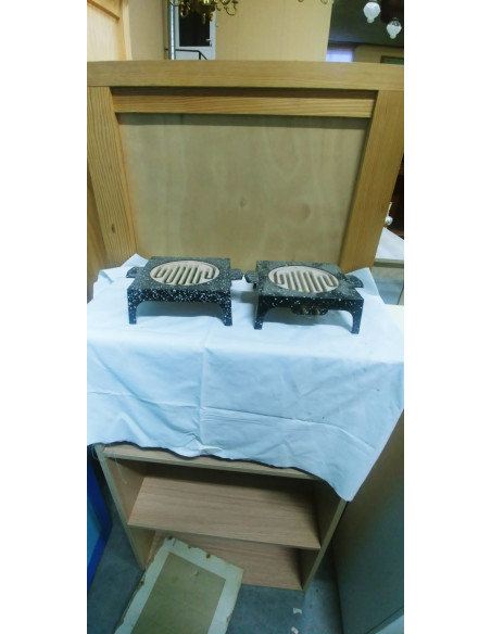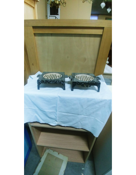 CALENTADOR ANTIGUO NEGRO CON PINTAS BLANCAS Y PARRILLA DORADA (PRECIO UNITARIO)